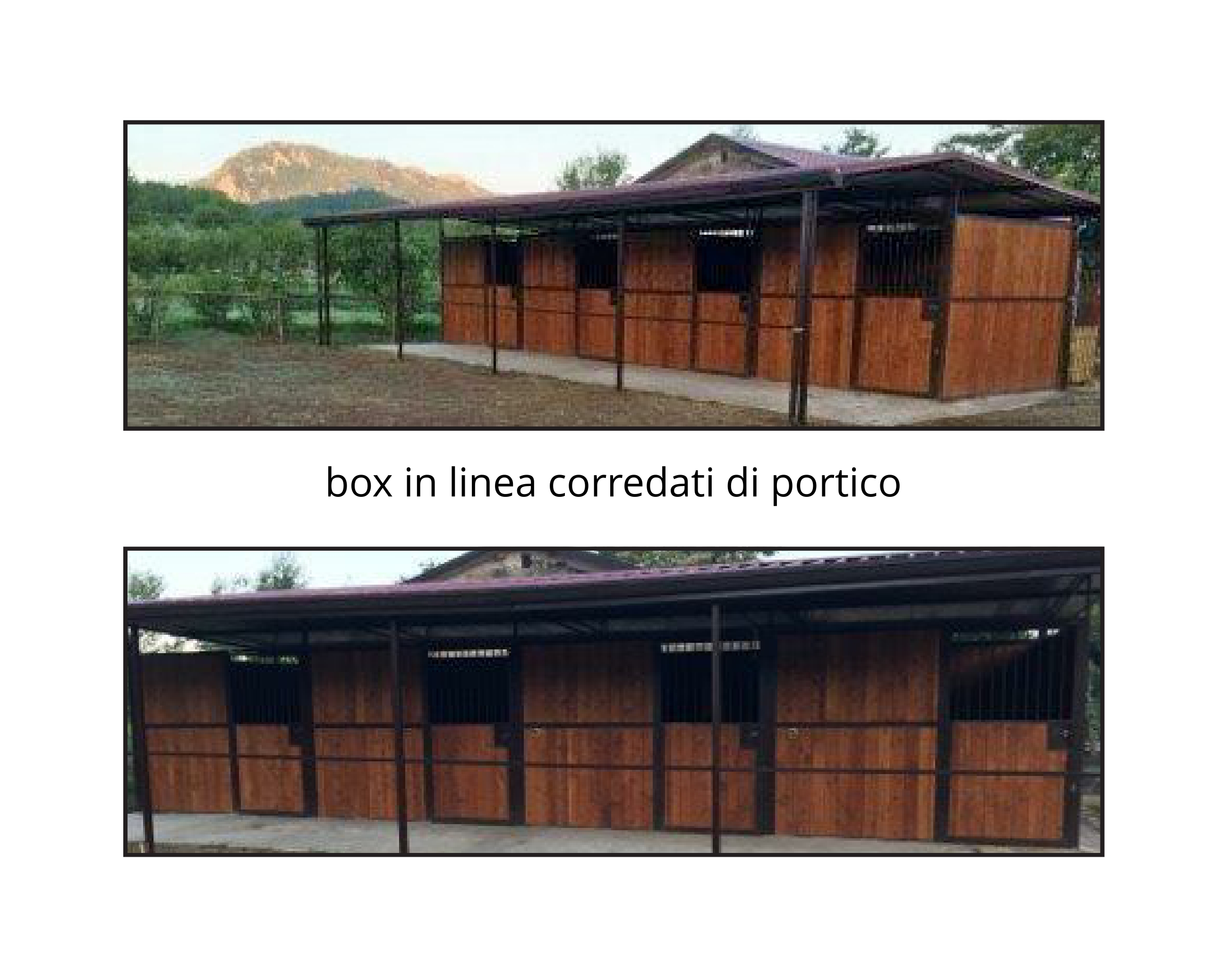 cod.0034 scuderia in linea da interno in acciaio zincatoOgni box ha misura: m 3 x m 3.La struttura è in acciaio zincato. I frontali sono semi panoramici con lato superiore a tondini e lato inferiore in legno di larice.Le porte sono scorrevoli.Ogni frontale è corredato di vano finestra.